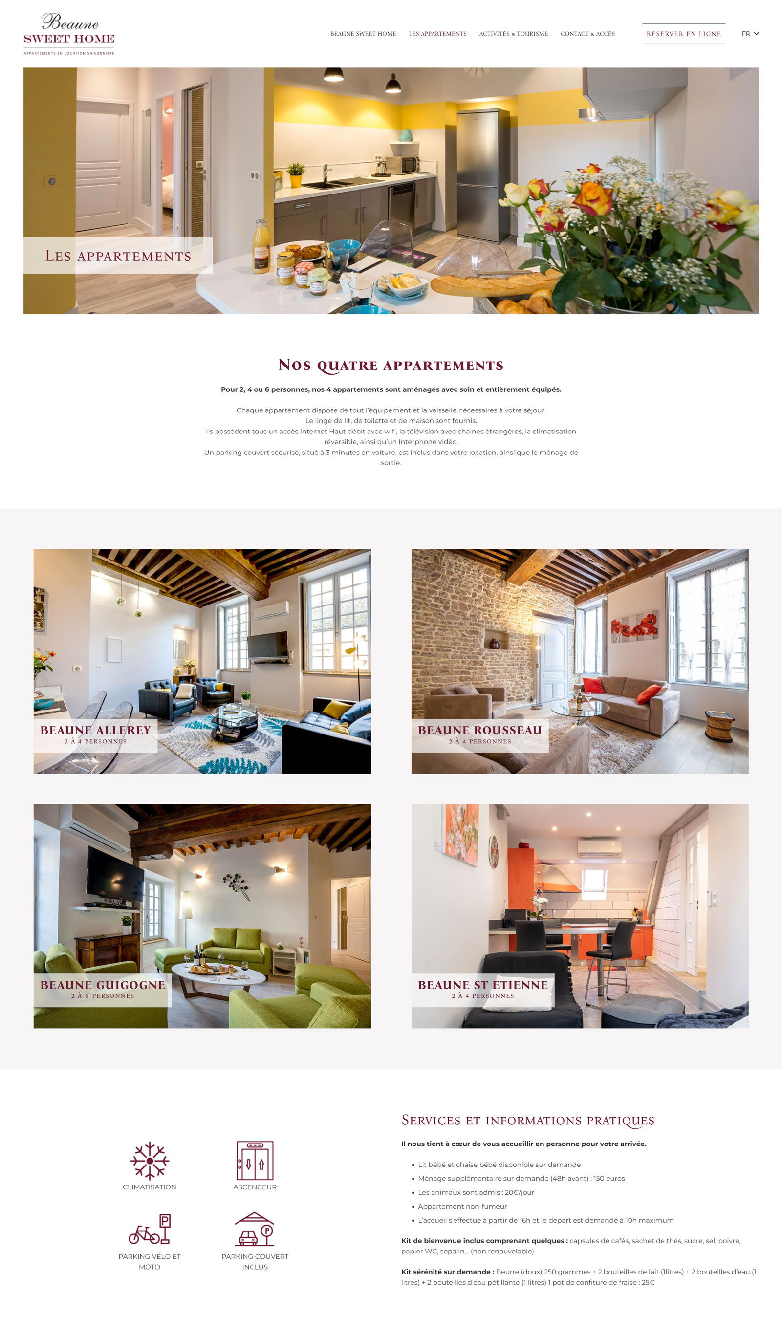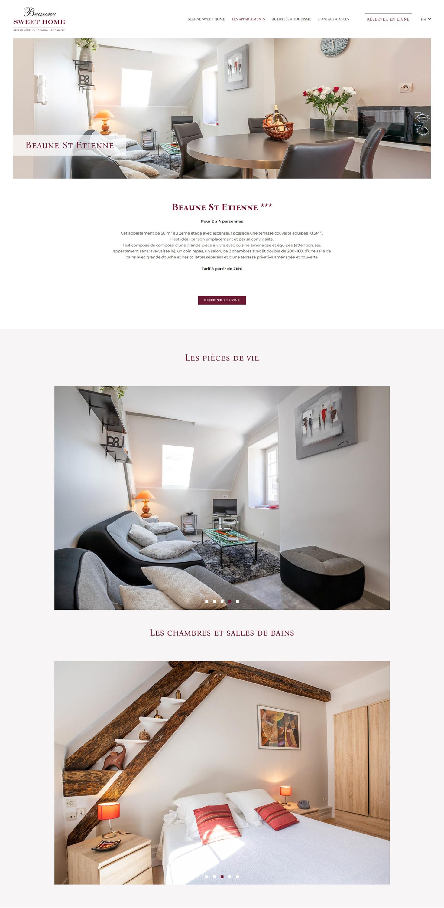 Chaque appartement dispose de sa propre page et comporte une partie description ainsi que deux diaporamas : l’un pour les pièces de vie, l’autre pour les pièces de nuit et salles de bains