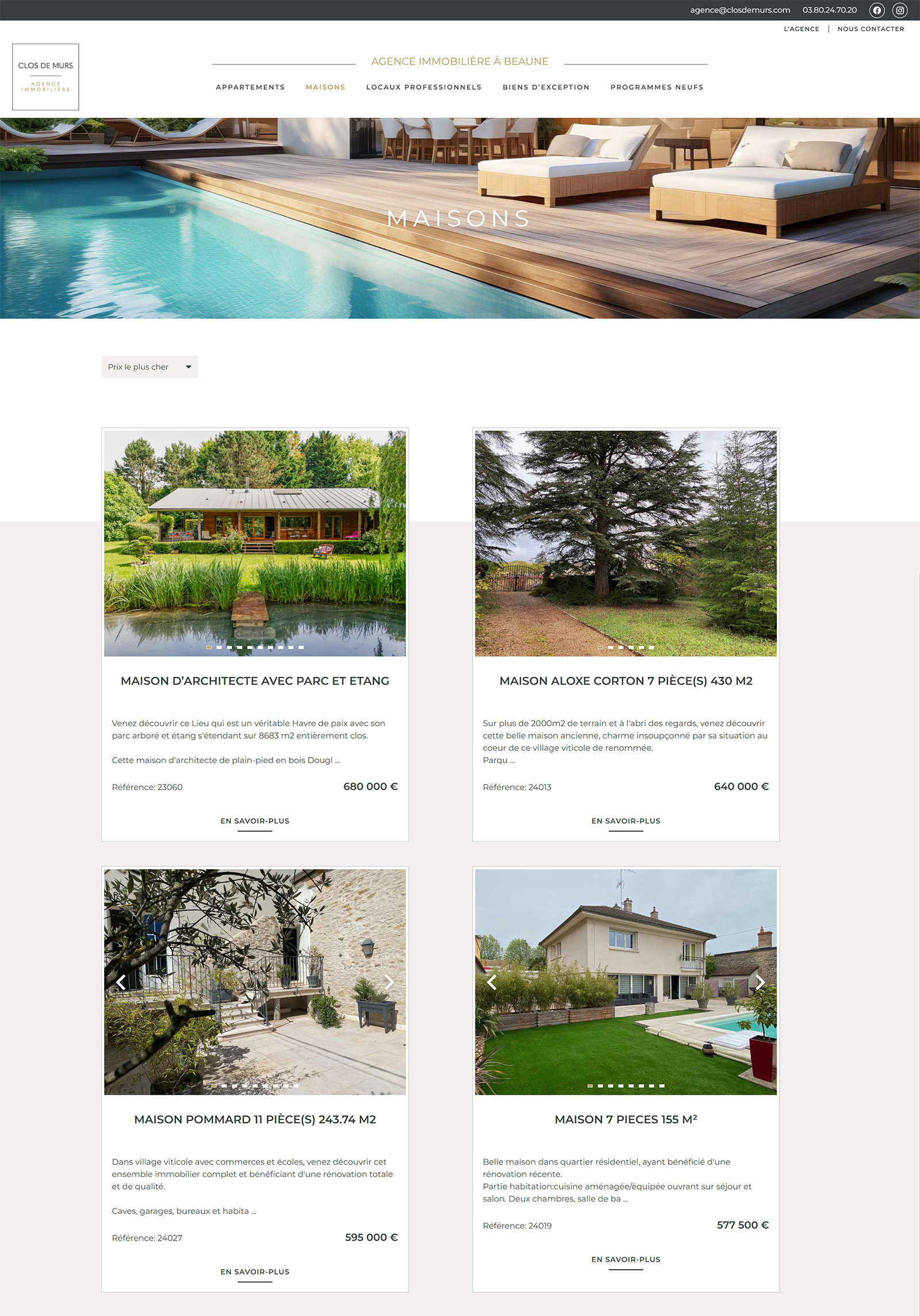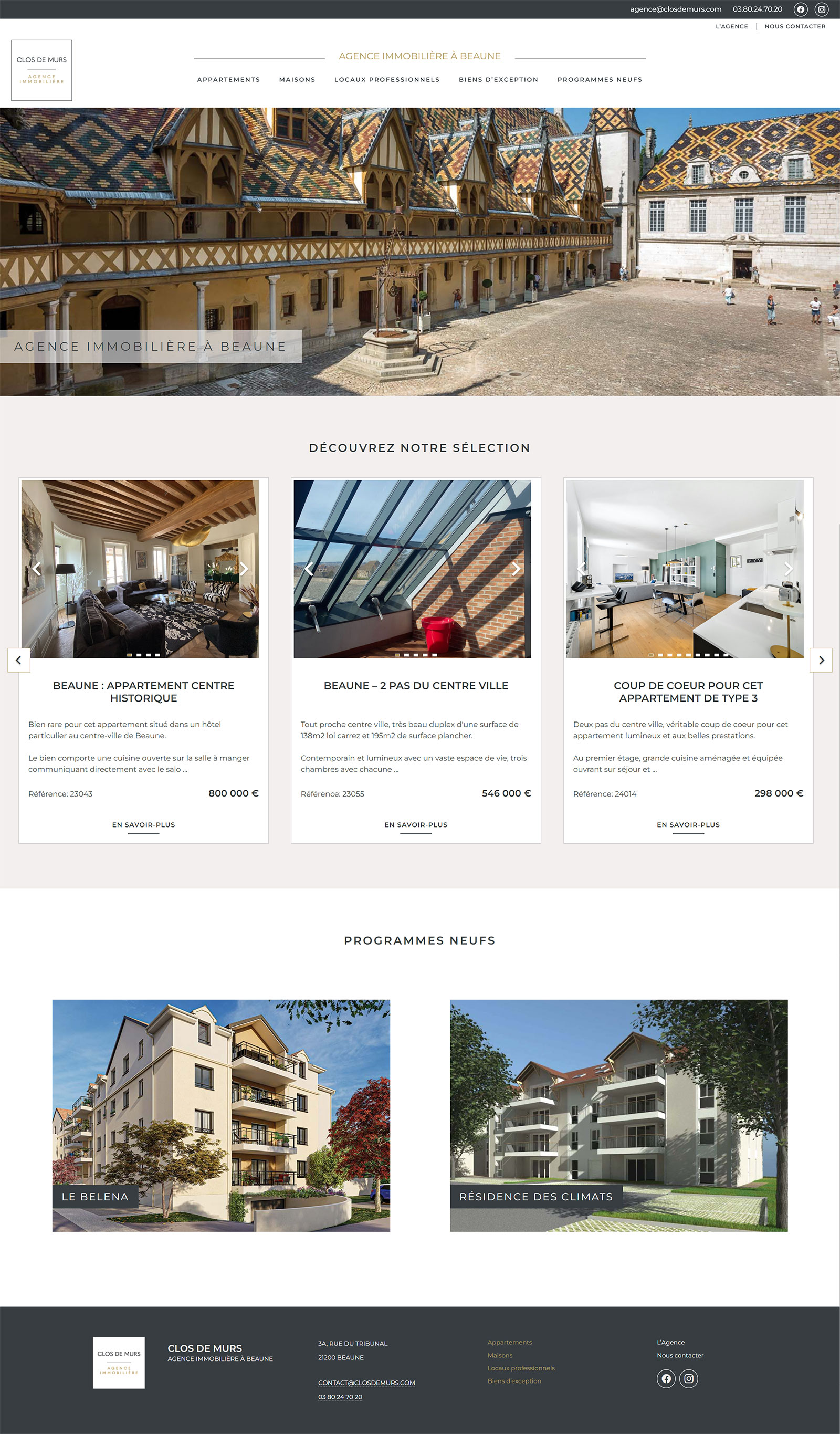 Situé au coeur de Beaune, l’agence Clos de Murs est spécialiste depuis de nombreuses années de l’immobilier en région Beaunoise. Incarnée par Claude Maufoux, bénéficiant d’une large expérience et d’une grande connaissnace du marché local, l’agence met un point d’honneur à l’accompagnement de ses clients avec des conseils avisés et un suivi rigoureux de chaque projet.