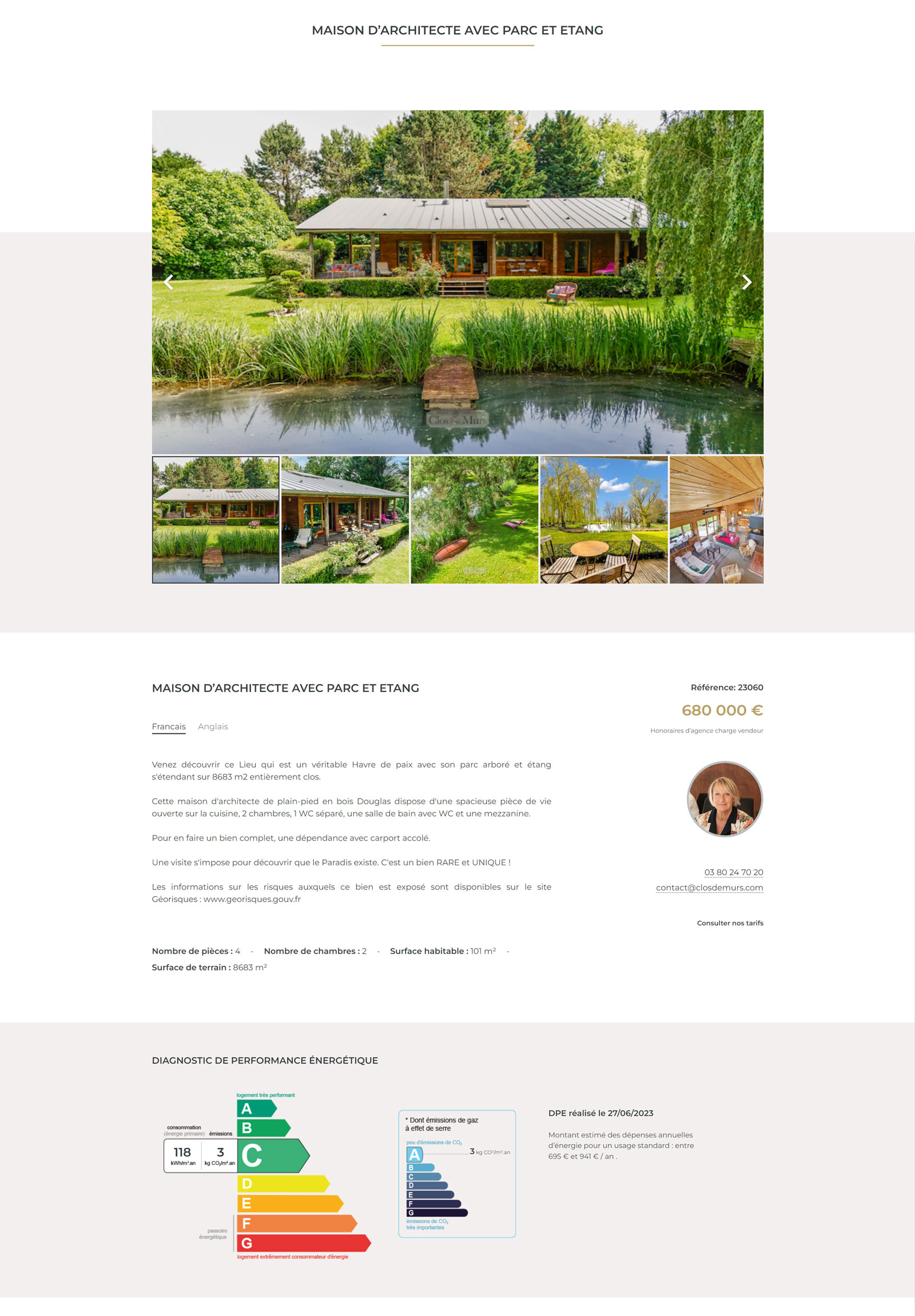 Nous avons réalisé un détail d’annonce en 3 parties : d’abord les images, puis une description soignée du bien en français et en anglais et enfin les informations liées au DPE et la consommation energétique.