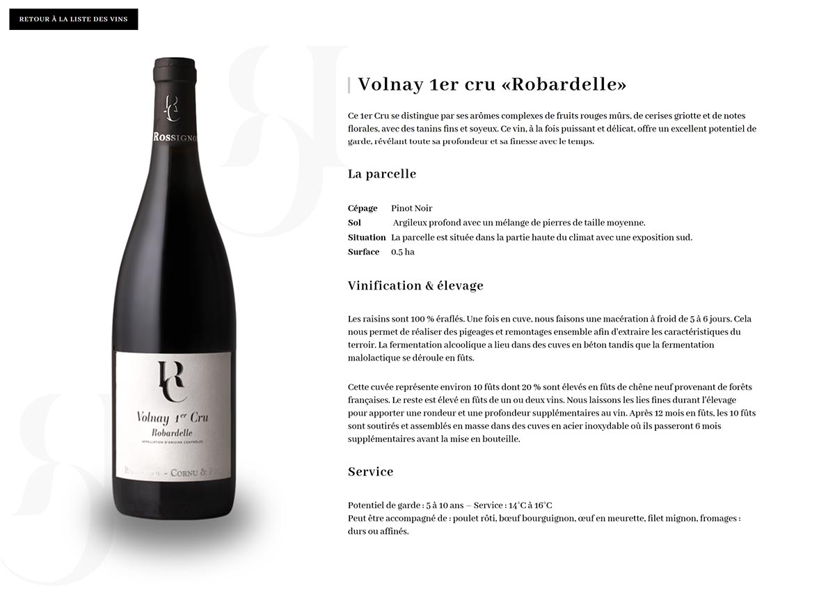 Client de longue date, le domaine Rossignol-Cornu nous a contacté pour la refonte de son site internet. Julien souhaitait un site qui corresponde au nouvel élan insufflé au domaine : une charte graphique plus moderne en édaquation avec ses nouvelles étiquettes et son logo. Il désirait également un site très simple et facilement accessible.