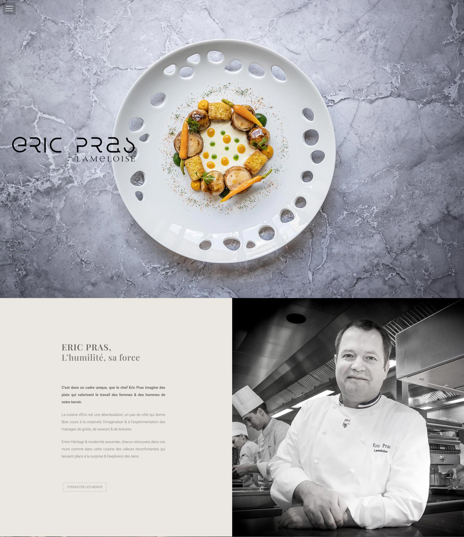 Une page est spécialement dédiée au chef : son parcours, son approche de la cuisine. Sa brigade est également mise en valeur.